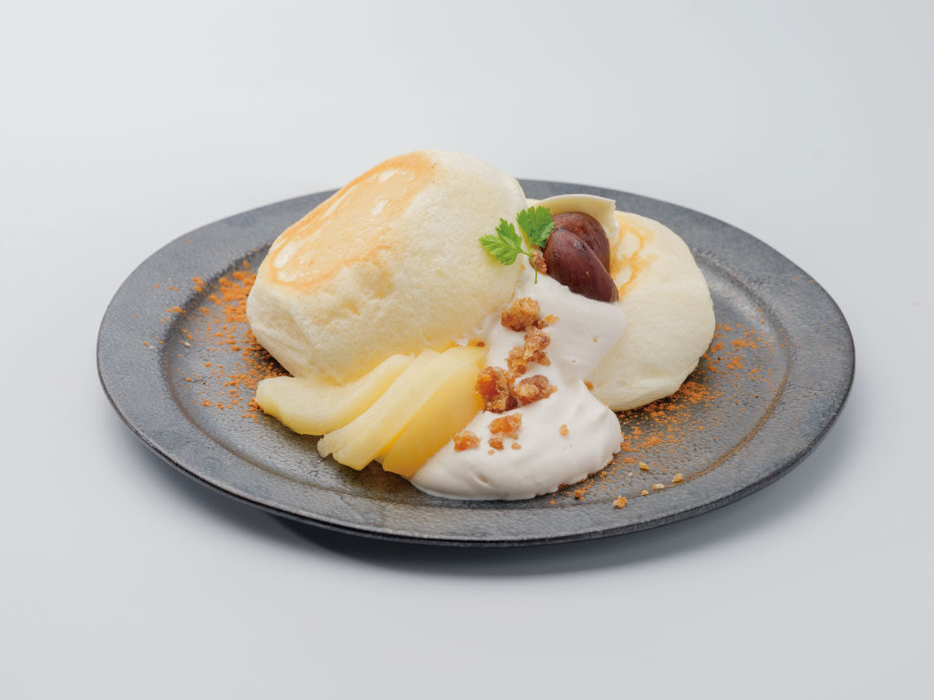 LaFrance, a pear native to France and grown only in Japan, is in season now. It is made into a refreshing compote and lavishly uses three types of chestnuts with different textures: marron cream, marron glacé, and astringent chestnuts. The gently sweet cream and lafrance are a perfect match for the pancakes. Enjoy autumn tamon with marron cream well mixed with compote and pancakes.